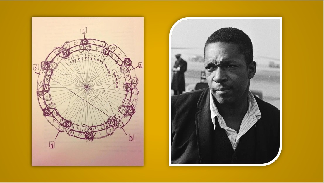 Coltrane Çemberi matematiğin ve müziğin nasıl etkileşime girdiğine dair ilgi çekici bir görselleştirme sunarken müzik geometrisi üzerine sayısız makaleye ilham kaynağı oldu. Beşli çemberine dayanan Coltrane’in bu yorumu, kromatik gamın 12 yarı tonunu tasvir ederek bunların notasyonlarını, göreceli tonlarını ve birbirleriyle ilişkilerini haritalandırır. Müzik teorisinde tanınabilir bir ilkeyi tasvir etmesine rağmen çizim bu bilgiyi sunma biçimi bakımından benzersizdir.