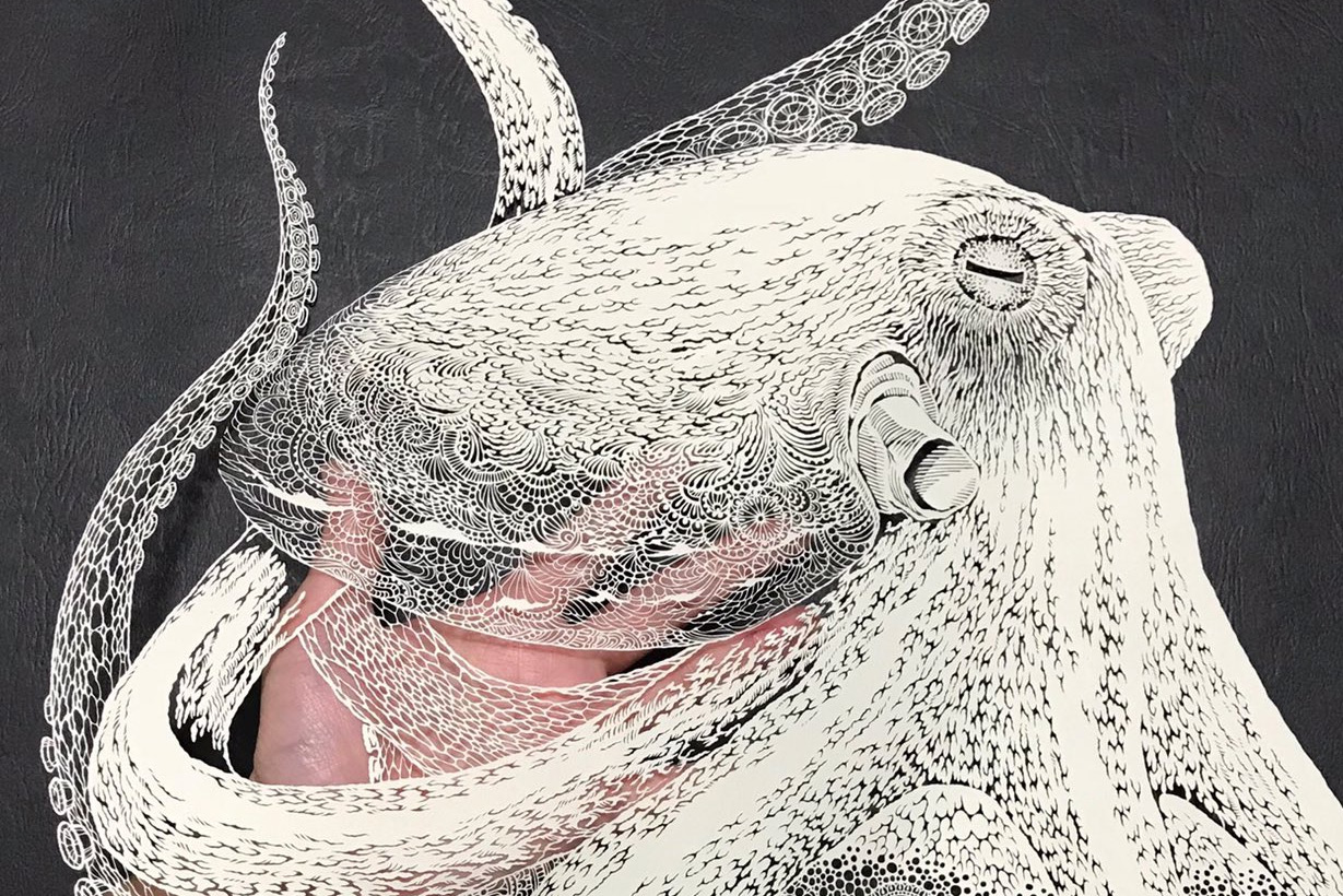 Karmaşık parça üst üste binen birkaç tabaka gibi görünmese de, aslında Fukuda geleneksel formuna sadık kaldı ve bir ahtapotun detaylı tasvirini yapmak için sadece tek bir sayfa kullandı. Detaylar o kadar başarılı ki bazı yerlerin kalemle çizildiğini düşünmek mümkün. Ancak daha yakından incelendiğinde, her detayın dikkatlice beyaz kâğıttaki boş alanlardan yapıldığını görülüyor.