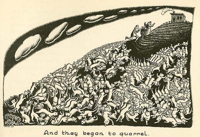 Wanda Gág’ın, 1928 tarihli eseri (11 Mart 1893 – 27 Haziran 1946) yazdığı Milyonlarca Kedi (Millions of Cats) yaygın olarak ilk Amerikan resimli kitabı olarak kabul edilir. “Yaşamak için çiz, çizmek için yaşa” sloganıyla yaşayan Amerikalı sanatçı, yazar, çevirmen, illüstratör ve baskı ustası Gág tarafından tasarlanıp el yazısıyla yazılan metin erkek kardeşi tarafından üretildi. Gág canlı illüstrasyonlarını “bir sanat sergisine göndereceğim her şey kadar sanat eseri” yapmaya çalıştı. Sonuç, kelimelerin ve resimlerin nadir uyumundan oluşan bir kitap oldu.