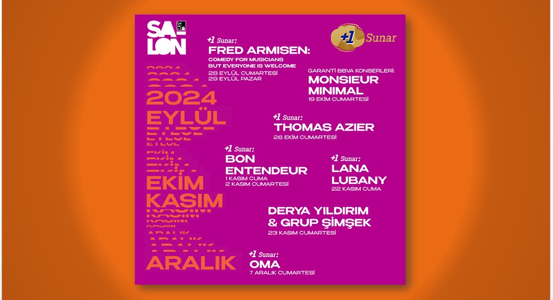 Salon’un +1 ve Garanti BBVA’nın destekleriyle yıl sonuna kadar ağırlayacağı isimler arasında kökleri Filistin’e uzanan, günümüz avant-pop sahnesinin en ilginç sanatçılarından Lana Lubany;yılın keşfi olmaya aday İngiliz dörtlü OMA; Yunanistan’ın güncel indie-pop öncüsü Monsieur Minimal;elektronik müzikle tutku dolu ilişkisini her notasında hissettiren Hollandalı müzisyen Thomas Azier vegüneşli, hedonist Fransız Rivierası’ndan Bon Entendeur yer alıyor. Bağlamacı ve multi-enstrümantalist Derya Yıldırım’a dünyanın dört bir yanından müzisyenlerin katıldığı saykedelik müzik kolektifi Derya Yıldırım & Grup Şimşek de Salon’un sonbahar programında.