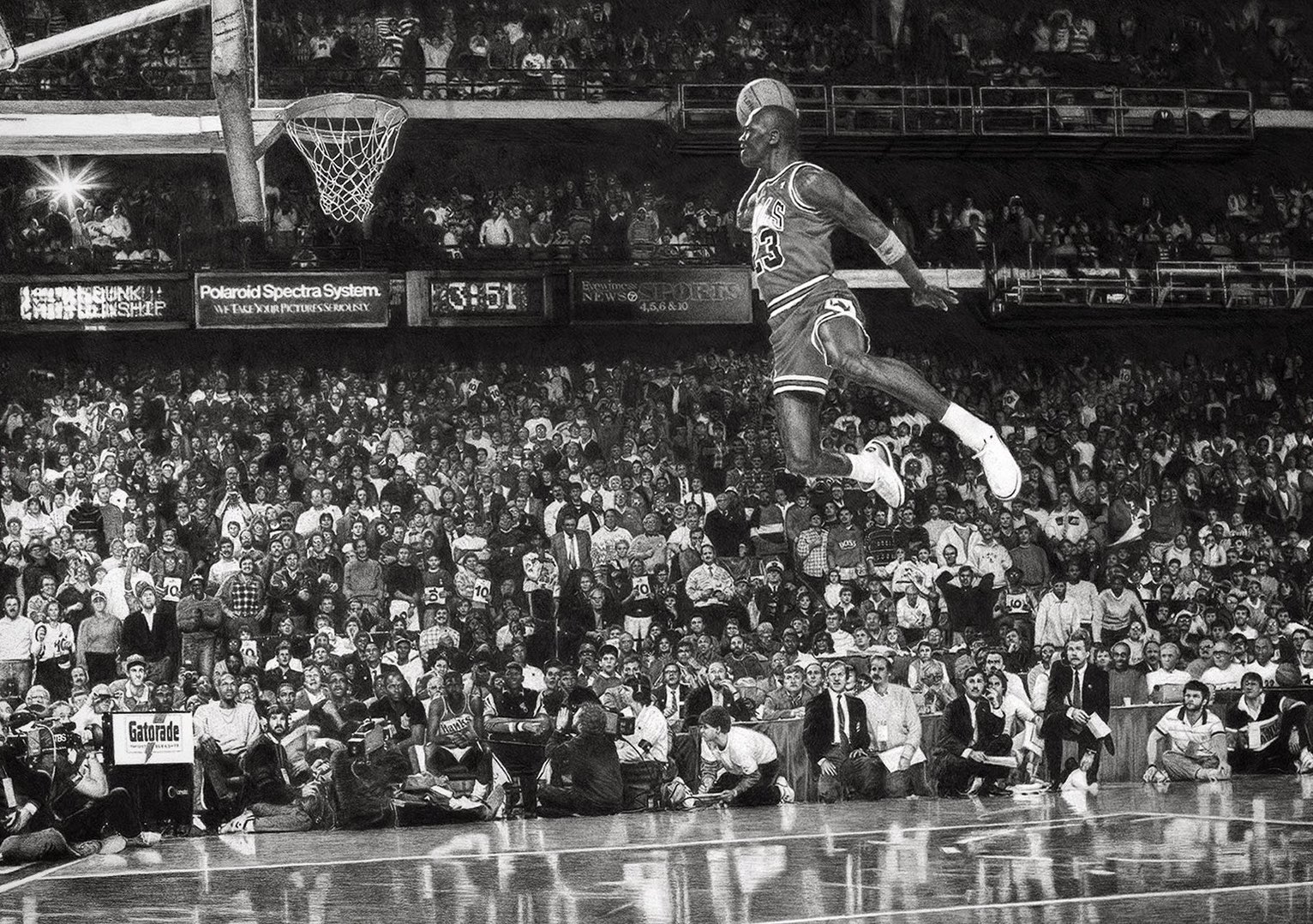 1988 NBA smaç yarışmasında adeta uçan Michael Jordan’ın portresi olan son projesini yaratması 250 saat sürdü. Çizim sosyal medyada paylaşıldıktan sonra Hall’un internet sitesi çöktü.