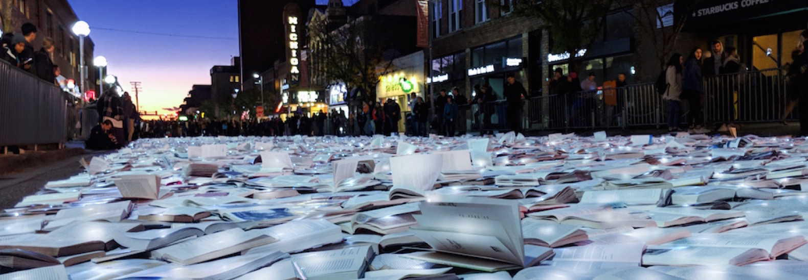 Literature vs Traffic’in son entalasyonlarında, İspanyol tasarım kolektif luzinterruptus, Ann Arbor, Michigan’da büyük bir caddeyi, 11 bin kitapla parıldayan bir nehre dönüştürdü. Yaya dostu alanların önemine dikkat çekmek için yapılan dev kurulum, normal zamanlardaki araba sesleri ve kirliliğinden tamamen sessiz bir bölgeye dönüştü. Gecenin sonunda, tüm kitaplar hızlı bir şekilde “geri dönüştürüldü” ve yaşanan olayın hatırası olarak ziyaretçiler tarafından eve götürüldü.