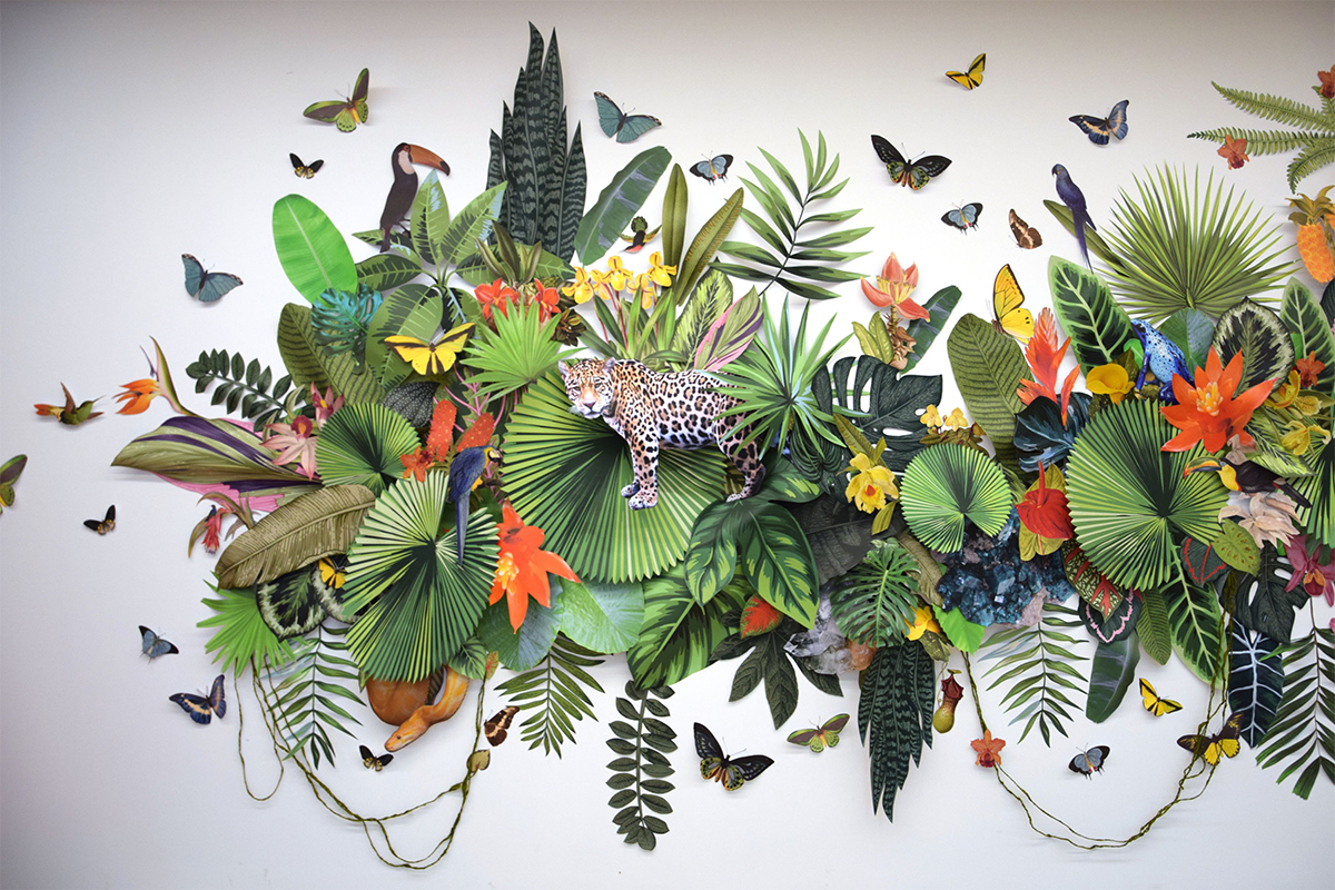 Ressam Clare Börsch’ün boyayla kaplı duvarlar ve küçük girintiler arasına yayılan kolajlı enstalasyonları, aşırı büyümüş ormanları ve ilginç orman sahnelerini taklit ediyor. Flora, fauna ve ara sıra değerli taş ya da insan figürü katmanları, mekanları fantastik ekosistemlere dönüştürüyor.