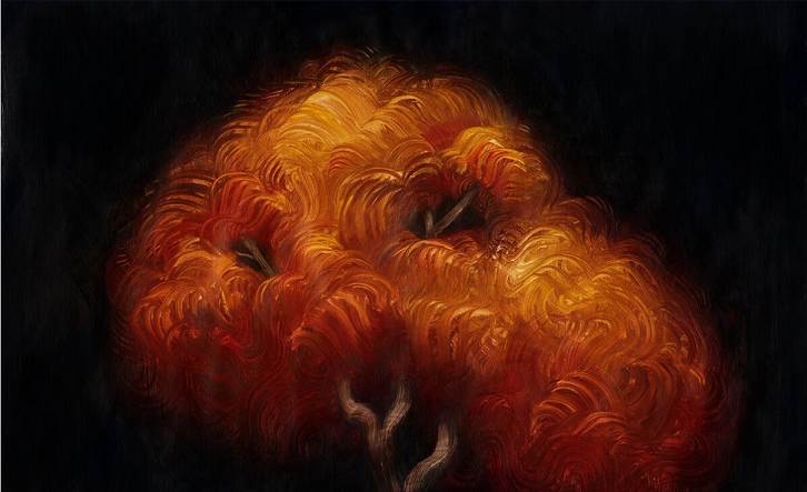 Diğer dizileri gibi, “Night Fall Trees” de Doyle’un enerjiyi saplantısına odaklanıyor. Dönen ağaç dalları birbirlerine sıkıca sarılıyor, yaprak tutamları üst dalları kavrıyor ve geniş kökler toprağa gömülüyor. Geçtiğimiz Ekim ayında gördüğü iyi aydınlatılmış bir ağaçtan ilham alan Doyle, bu serinin mevsimler ve ağaçların sahip olduğu esneklikle ilgili olduğunu da söylüyor.
