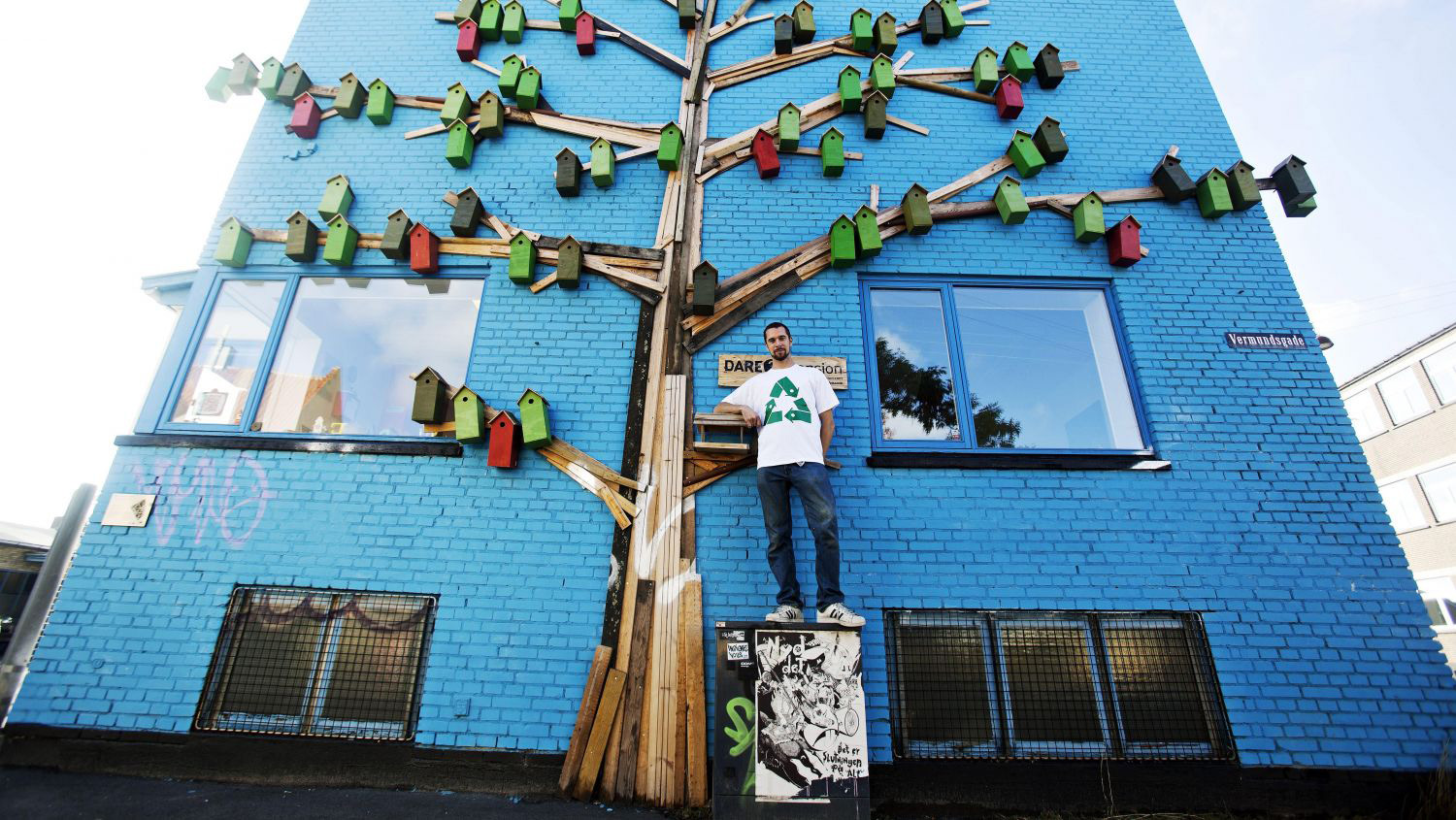 Thomas Dambo, atık malzemelerden aile dostu kurulumlar konusunda uzmanlaşmış bir sanatçı ve tasarımcı. Dambo’nun birçok etkileşimli projesinden biri de sokak sanatının ve toplumun gelişmesinin kesişme noktasında bulunan ve devam eden bir seri olan Happy City Birds. Danimarkalı sanatçı kent merkezlerinde kuş evi inşa ediyor ve bu yeni kuş evlerini binalara asıyor.