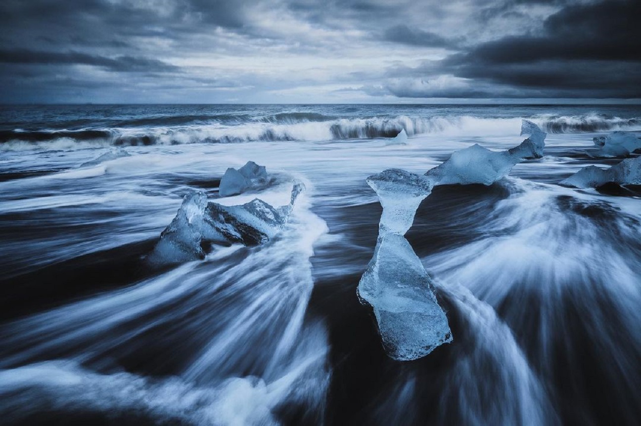 Büyük parıldayan buz parçalarıyla dolu siyah kumlu bir plaj, İzlanda’da en çok ziyaret edilen yerlerden biri ve fantastik bir filmden çıkmış gibi görünüyor.