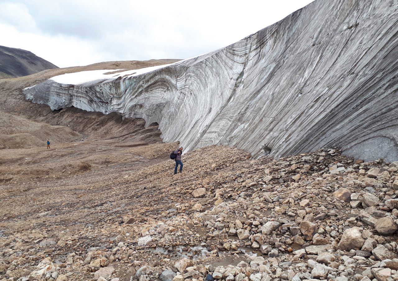 Keçi Dağı Zirvesi yakınlarında eriyen buzun yüzeyinde üstü eğimli ahşap bir yürüme asası da bulundu.