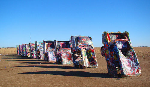 1974 yılında inşa edilen Cadillac çiftliği, eksantrik milyoner Stanley Marsh’ın ve San Francisco’da bir sanat kolektifi olan Ant Farm’ın ortaklığının ürünü.
