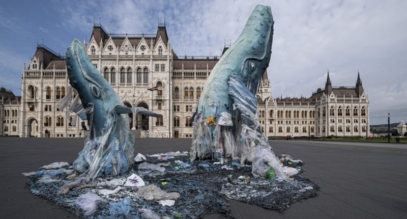 Greenpeace eylemcileri, Macar Parlamentosu önünde bir plastik atık denizinden çıkan iki balinanın gerçek boyutlu heykelini yaptı. Kâğıttan yapılmış dev balinalar, farklı denizlerde tek kullanımlık plastik atık kirliliği hakkında farkındalığı arttırmak için yaratıldı. Yerel Greenpeace aktivistleri, Macar hükümetinin, komşuları Avusturya ve Romanya’da olduğu gibi tek kullanımlık plastik poşetleri yasaklamasını istiyor.