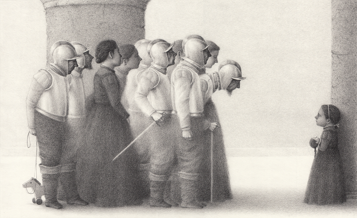 Meksika merkezli sanatçı David Alvarez, geniş bir renk paletine ihtiyaç duymadan, sadece siyah beyaz çalışarak doku ve kontrast bakımından zengin resimler oluşturmaya devam ediyor. Beyaz ve krem renkli kâğıda grafit ve odun kömürü katmanları karmaşık gölgeler oluşturan sanatçı, önemli noktaları negatif alanda ortaya çıkarırken ışığı kimi zaman taş duvarlara kimi zaman yüzlere yansıtıyor. Yaratık tasvirleri, Alvarez’in defterine çeşitli zamanlarda rastgele çalıştığı kişisel projelerinden.