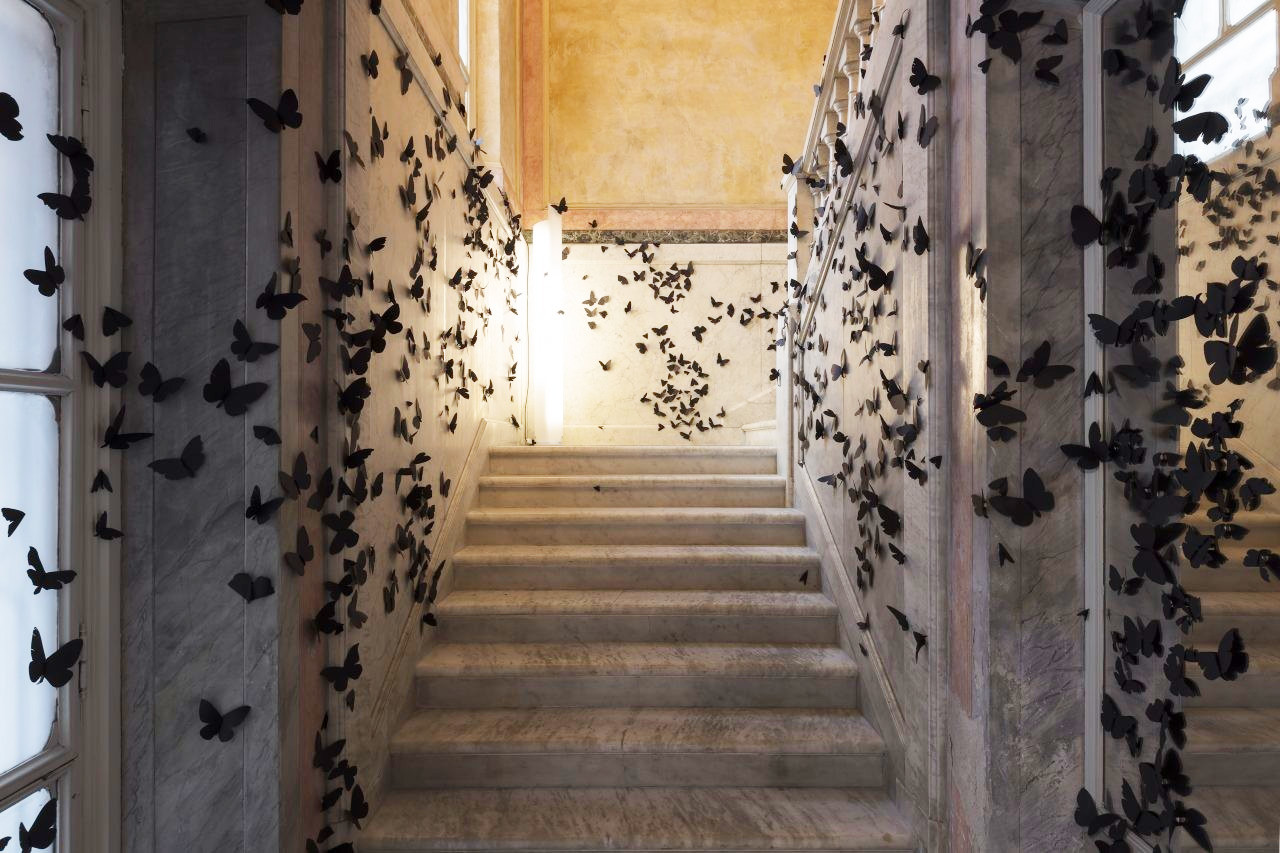 Çeşitli ebat ve türdeki siyah kelebeklerden oluşan sürü, Milano merkezli Fondazione Adolfo Pini’nin merdivenlerini, aynalarını, duvarlarını ve kapılarını ele geçirdi. Karanlık ve geniş sürü, Meksikalı sanatçı Carlos Amorales’ın 10 yıldan fazla süren Black Cloud dizisinin devamı olan ACCURSED HOUR isimli kişisel sergisinin bir parçası. Kelebekler, diğer insanlara karşı insan şiddetinin doğasını ele alan, gri tonlu insan ve ağaç siluetlerinden oluşan Life isimi kağıttan bir yerleştirmeyi çevreliyor. Amorales’in projelerinin daha fazlasını internet sitesinde ve Instagram’da görebilirsiniz.