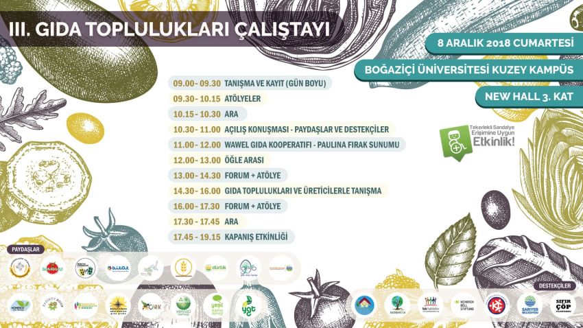 Üreticiler, türeticiler, gıda toplulukları temsilcileri ve meraklılarını 2016 yılından bu yana bir araya getiren Gıda Toplulukları Çalıştayı’nın üçüncüsü 8 Aralık Cumartesi günü Boğaziçi Üniversitesi’nde gerçekleştiriliyor.