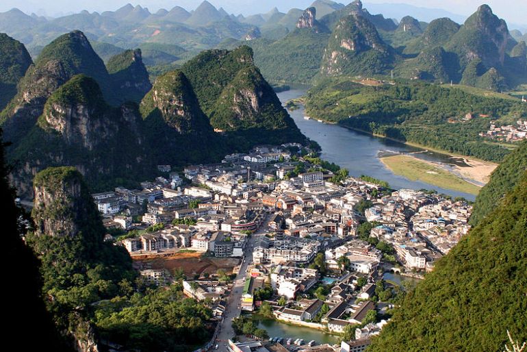 Gulin şehrine bağlı bu kasaba, muhteşem manzarası, yemyeşil ağaçlarla kaplı karst tepeleri, mağaraları, Li Nehri ve tapınaklarıyla turistlerin ilgisini çeken tipik Çin kasabalarından oldukça farklı bir yer. 110 sene önce, deniz olan bu beldede deniz birden yok olunca bu birbirinden ilginç tepeler oluşmuş.
