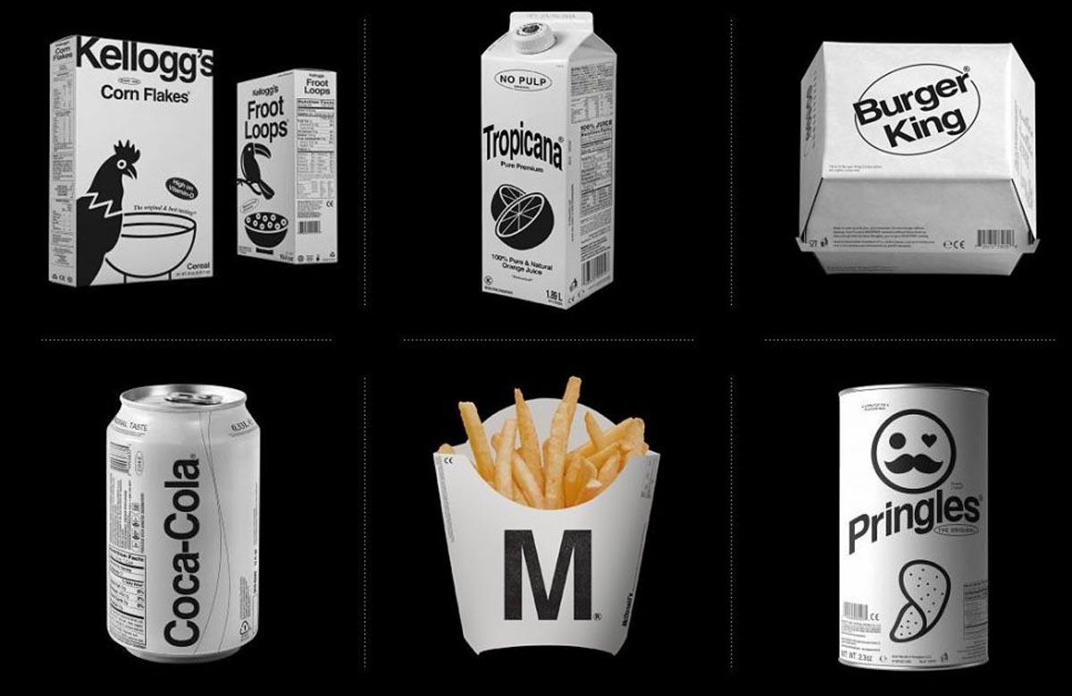 Kunel Gaur, distopik monokromatik bir dünyada ünlü markaların nasıl görüneceğini hayal etti. Deney, renkli tasarlanmış ürünler arasında raflarda öne çıkacak tek renkli, oldukça hoş ambalaj tasarımları üretti.