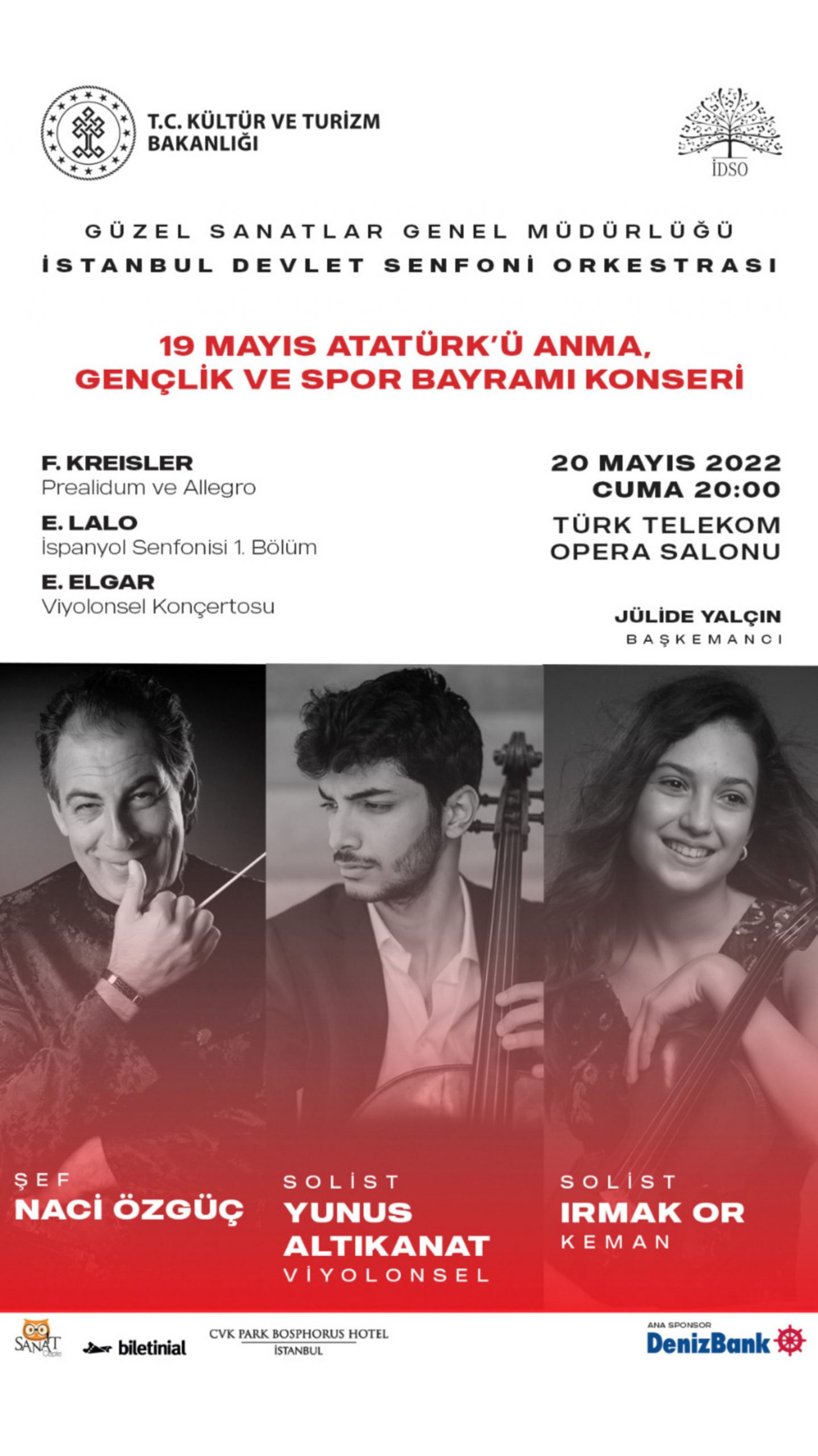 20 Mayıs 2022 Cuma akşamı saat 20.00’de İstanbul AKM – Türk Telekom Opera Salonu’nda gerçekleştirilecek İDSO DenizBank Atatürk’ü Anma, Gençlik ve Spor Bayramı Konseri’ni; Ankara Devlet Opera ve Balesi orkestra şefi Naci Özgüç yönetecek. Bu haftaki konserde; 19 Mayıs coşkusu ile genç ve parlak solistlerin enerjisi bir araya gelecek. Konserde eğitimine Berlin’de devam eden genç, başarılı viyolonsel sanatçısı Yusuf Altıkanat ve uluslararası yarışmalarda önemli dereceler elde ederek, Türkiye’yi başarıyla temsil eden keman sanatçısı Irmak Or sahne alacak.