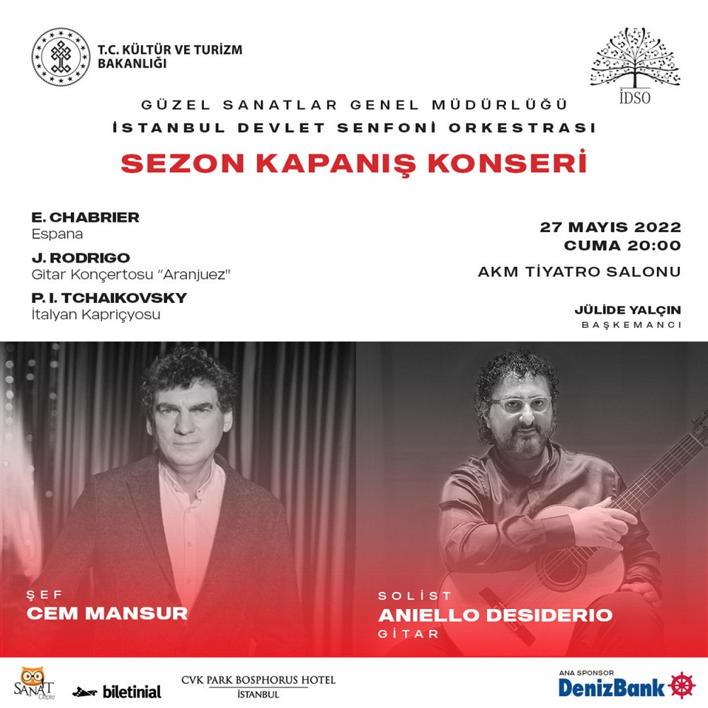 Her konseriyle bambaşka bir müzik yolculuğunun kapısını aralayan İDSO DenizBank Konserleri; sezonun son konserinde dinleyicilerini, yine önemli bestecilerin oluşturduğu ezgilerle buluşturacak. Emmanuel Chabrier’in İspanya’ya, Pyotr İlyiç Tchaikovsky’nin İtalya’ya, Joaquín Rodrigo’nun ise Aranjuez Sarayı’na yaptığı yolculuk sonrası bu yerlerin sesini, kokusunu, ruhunu yapıtlarına işlediği eserlerin yer aldığı konser repertuarında bu hafta; Chabrier’in “Espana”, Rodrigo’nun Gitar Konçertosu “Aranjuez” ve Tchaikovsky‘nin “İtalyan Kapriçyosu” seslendirilecek.