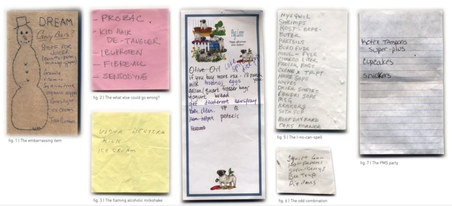 Defter kağıdına, eski fişlere, zarflara, kırtasiye malzemelerine, post-it’lere ve çeşitli kağıt parçalarına karalanmış listeler arasında çok eğlenceli olanları da var. Listeler bir yabancının beslenme alışkanlıklarından yazım becerilerine kadar o kişinin hayatına dair bir bakış açısı sunuyor. Görünüşe göre hiç kimse mayonez, yoğurt veya hatta muz kelimelerini düzgün yazamıyor.