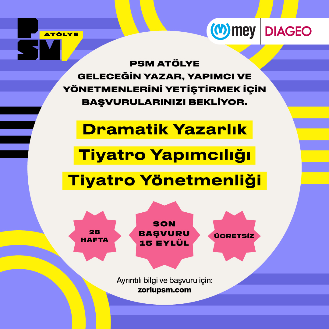 Kültür sanata sürdürülebilir destek sağlamayı görev bilen Mey|Diageo ile Zorlu PSM’nin, tiyatroya yeni yetenekler kazandırmak amacıyla birlikte sürdürdüğü PSM Atölye’ye kayıtlar devam ediyor!