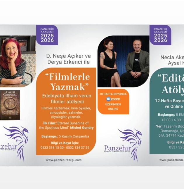 Panzehir Akademi’nin kurucusu Aysel Karaca’nın düzenlediği ve büyük ilgi gören “Aysel Karaca ile Derin Okumalar” atölyesinin yanı sıra bu yıl eklenen, Dilek Neşe Açıker ve Derya Erkenci’nin düzenlediği “Filmlerle Yazmak” adlı atölye edebiyata ilham veren filmlerden yola çıkarak yepyeni bir yazma deneyimi sunuyor.