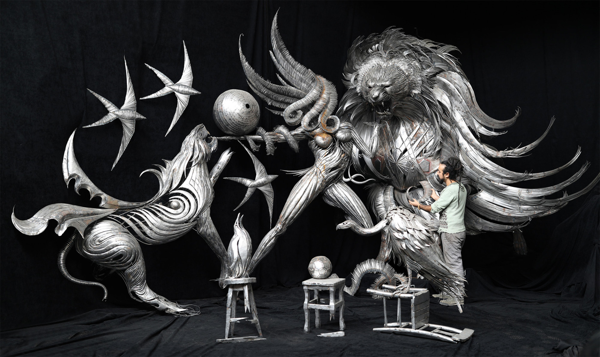 Sanatçı Selçuk Yılmaz, 20.0000’den fazla metal parçayı bir araya getirip kaynak yaparak insanların ve iklim krizinin verdiği zararlar sonrası doğal dünyanın enerjisini gösteren devasa heykeller yaratıyor. Türkiye merkezli sanatçının son projesi Blue Planet’i tamamlaması yaklaşık iki yıl sürdü ve neredeyse 220 kilo ağırlığında ve 10 metre boyunda heykeller söz konusu.