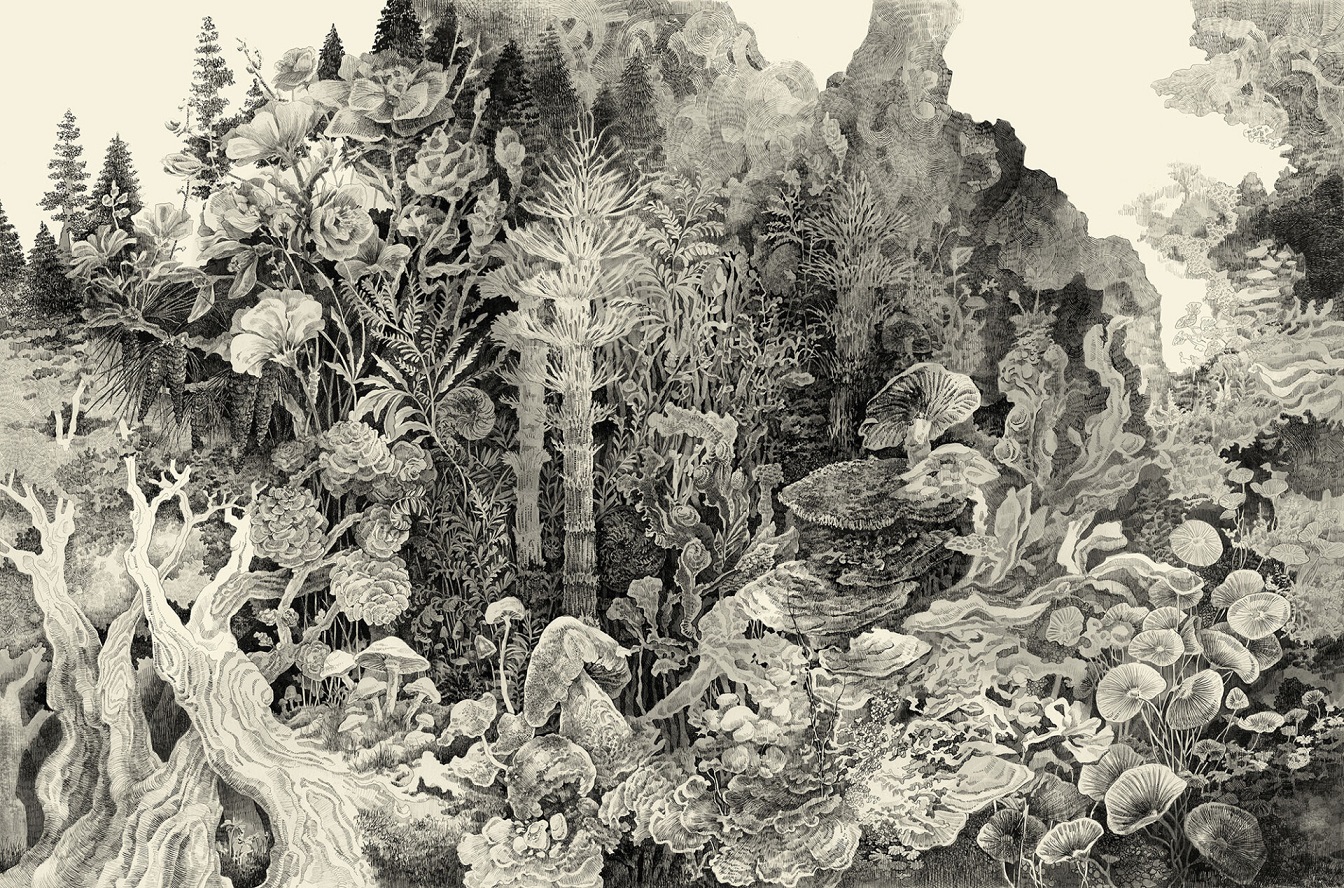 Atlanta merkezli illüstratör Song Kang, dünya dışını akla getirir bir şekilde tasvir edilen kara ve denizden gelen unsurlarla dolu zengin labirentler yaratıyor: Bonsai’den şeker renkli sıvı damlamalarına, balıklar ve kelebeklere kadar aynı yoğun ekosistemde bir arada var olan yaratıkların bir M.C labirenti. Escher tarzı kertenkeleler de sayfaya yayılıyor. Her illüstrasyon, evrim fikirleri ve doğada var olan bağlantılardan ilham alan, hem konu hem de Kang’ın sürecinde kendilerini gösteren temalardan oluşuyor. Kang’ın çalışmalarını Instagram hesabından takip edebilirsiniz.